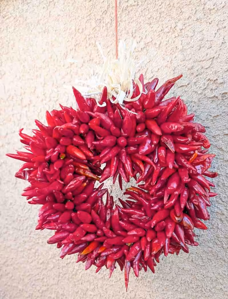 These Hatch Pequin Chile Wreaths are available fresh in New Mexico in the early middle of the chile season every year. Typically they are available fresh locally by Labor Day, which coincides with the Hatch Chile Festival. Because of this, we let them dry out a few weeks in the sun before shipment. Expect us to begin shipping these ristras by the middle of September for the 2025 Hatch chile season! We will start shipping chile ristras across the continental US at that point in the chile season. For more information, check out our page, chile ristras.