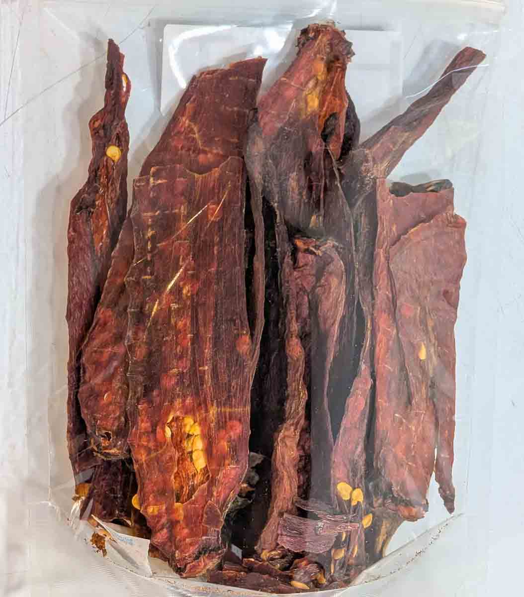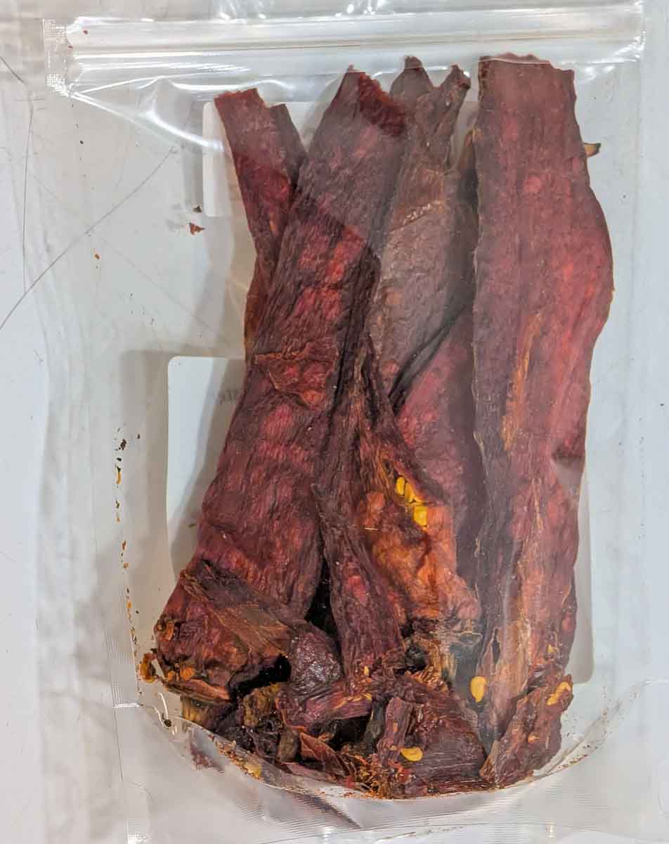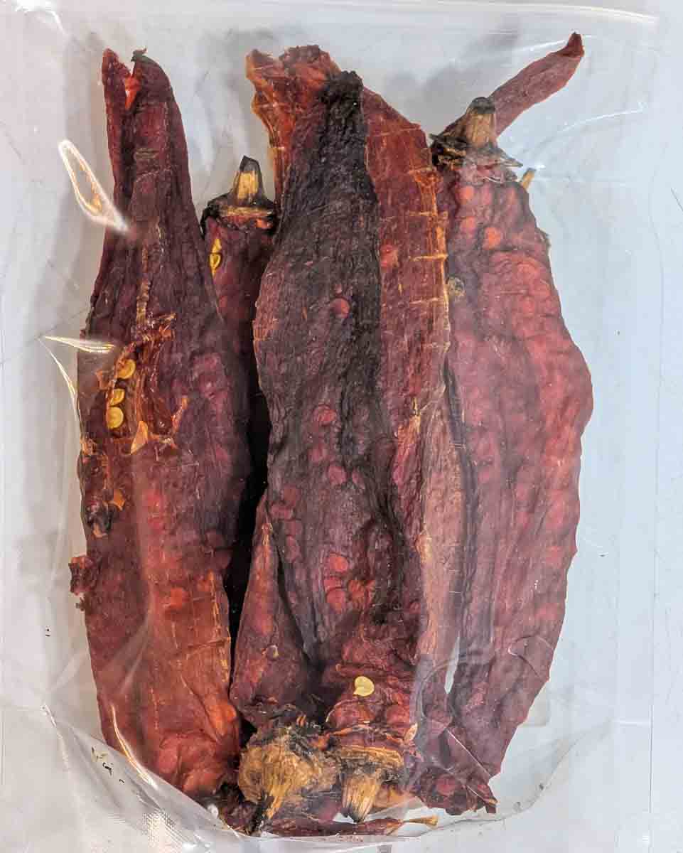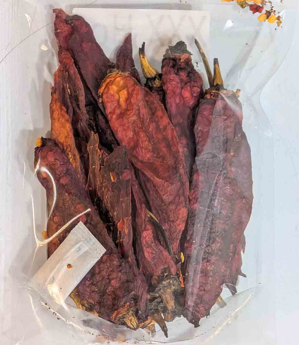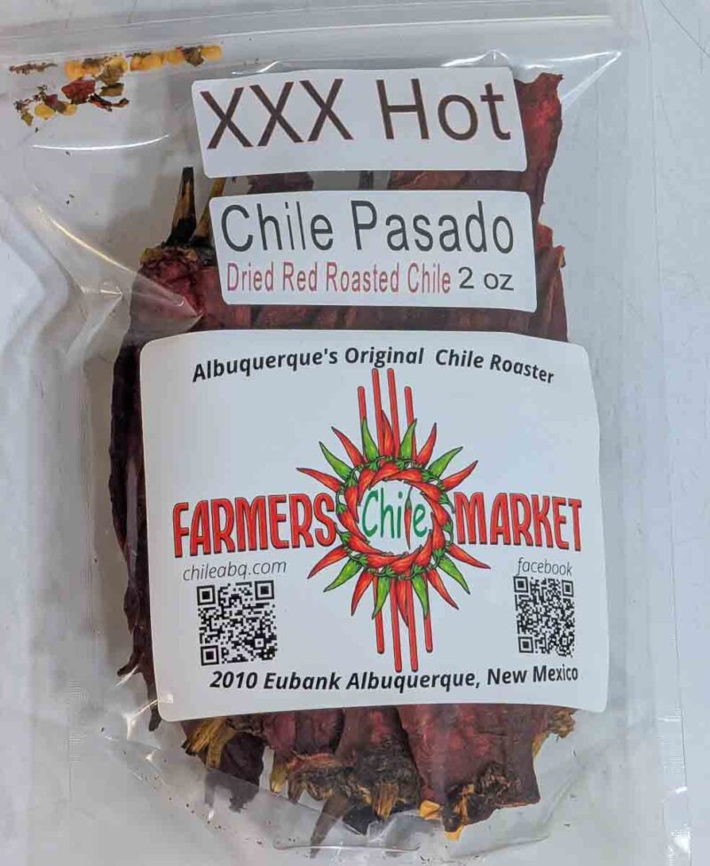 2 oz bags of red chile pasado. Chile pasado is roasted, peeled, and dried Hatch chile, with this being red chile specifically! Red chile is a bit sweeter than green as it is a more developed chile, but it’s roasted to perfection, washed, peeled, and dried. This is a great way to get the flavor of roasted Hatch red chile! When traveling or sending a gift, I highly recommend this product for people buying in our store in Albuquerque. Just add water, and it puffs right back up in only a minute! We also have green chile pasado!