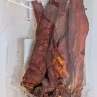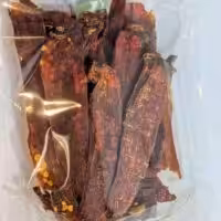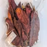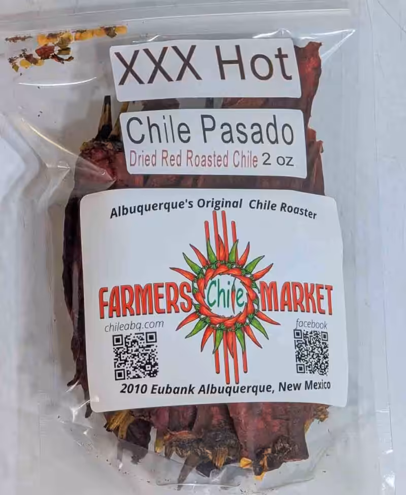 2 oz bags of red chile pasado. Chile pasado is roasted, peeled, and dried Hatch chile, with this being red chile specifically! Red chile is a bit sweeter than green as it is a more developed chile, but it’s roasted to perfection, washed, peeled, and dried. This is a great way to get the flavor of roasted Hatch red chile! When traveling or sending a gift, I highly recommend this product for people buying in our store in Albuquerque. Just add water, and it puffs right back up in only a minute! We also have green chile pasado!