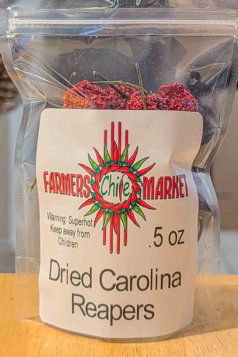 the back of a bag full of dried carolina reapers chili peppers