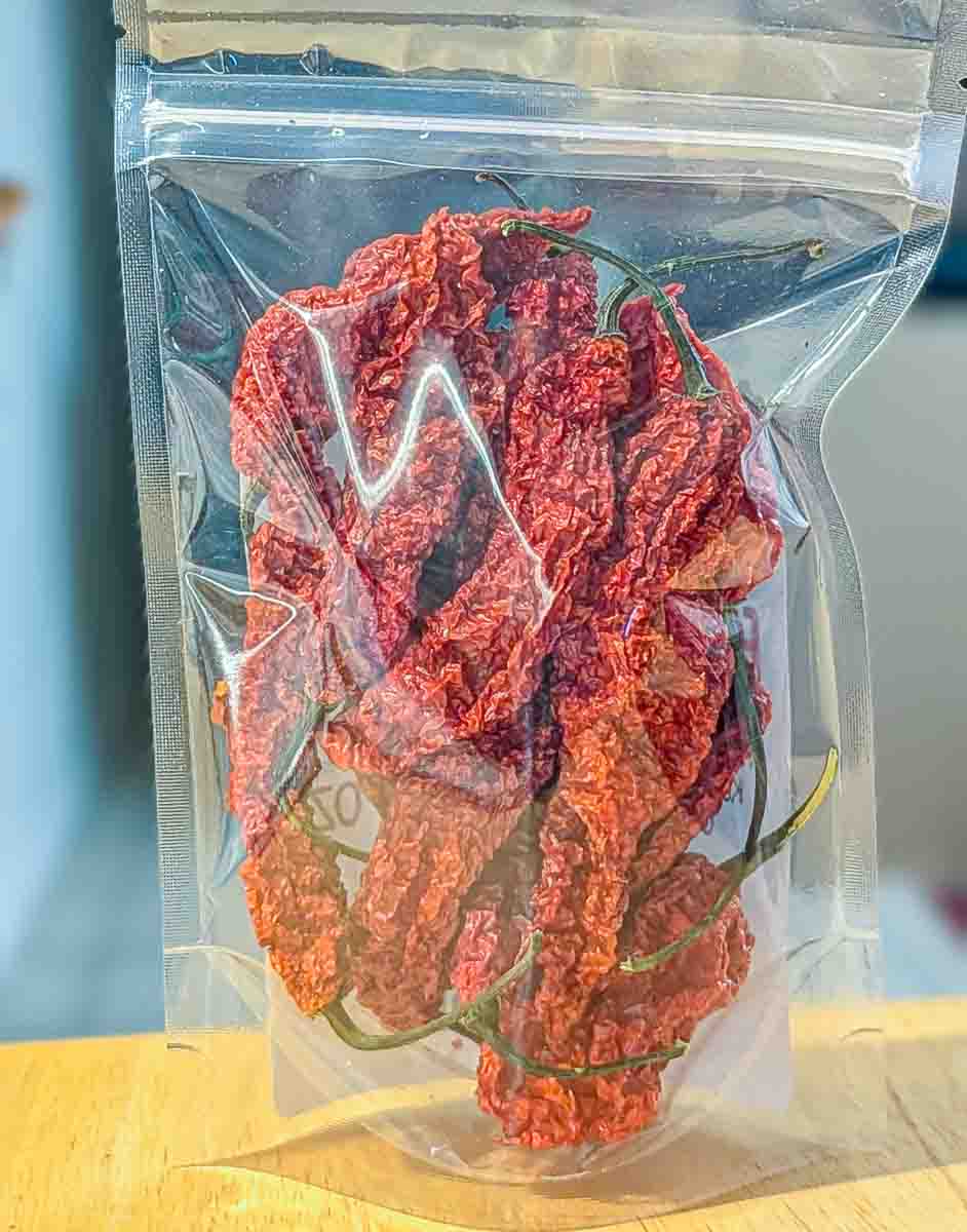 the back of a bagful of Bhut Jolokia or ghost peppers